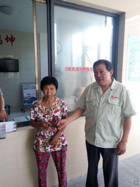 图为封先生爱人在金年会app玻璃厂门口从吉国达手中接过手机。