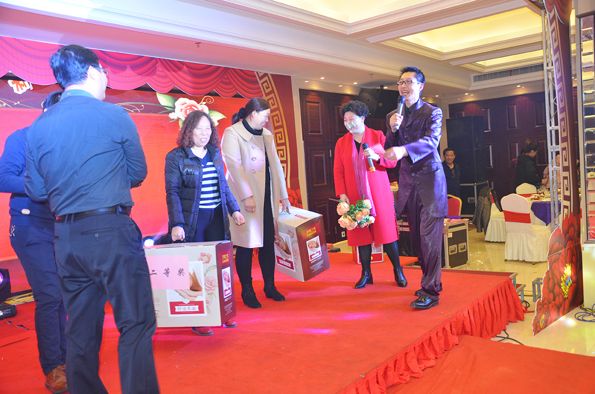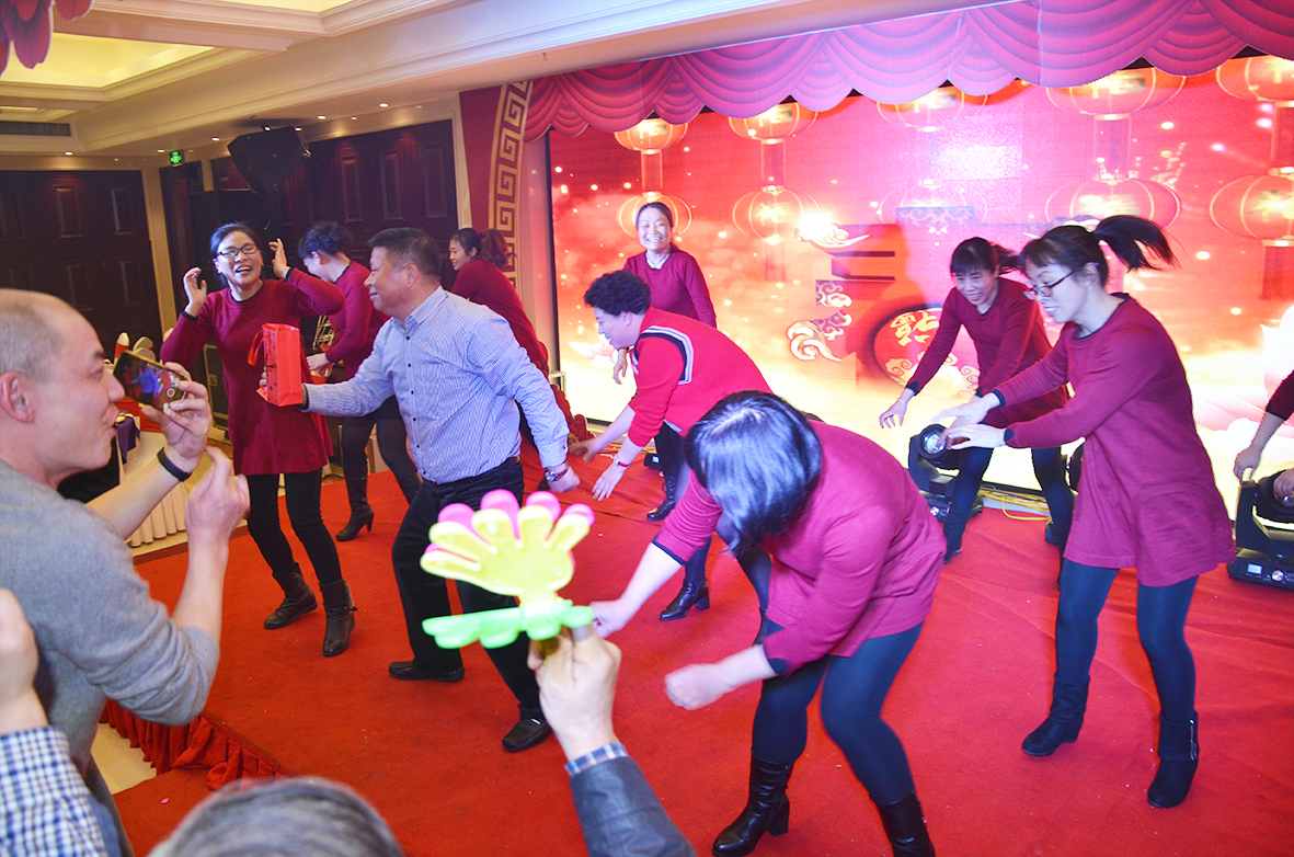 销售部徐美娟、刘凌为全场观众献上了一首《给你们》,正如歌词所唱“一定是特别的缘份,才可以一路走来变成了一家人”,如此应景的歌曲正是金年会app人与人之间,似朋友更似亲人的真实写照;吕燕和高维静带来了脍炙人口的《自由飞翔》,全场观众跟着熟悉的节奏放声齐唱;整场演出高潮迭起,有高亢的《青藏高原》和《天路》、爆笑全场的二人转表演、更有演员带来的辣歌劲舞;嘉宾代表也即兴为我们带来了京剧《贵妃醉酒》、独唱《九寨沟之子》,赢得了满堂喝彩……在演出的间隙,主持人穿插着进行了抽 奖和有奖竞答,台上台下互动热烈。由董事长洪爱萍领衔的《摘钱舞》将整场晚会的气氛推向了高 潮,舞台上穿着红色衣服的演员们喜笑颜开,跟着音乐舞动全身。员工、嘉宾们纷纷涌上舞台跟着欢快的节奏,一起起舞,台下的观众拿出手机和相机记录下这欢快的时刻。整场联谊晚会在感恩、真情、欢快、喜庆的气氛中落下了帷幕。